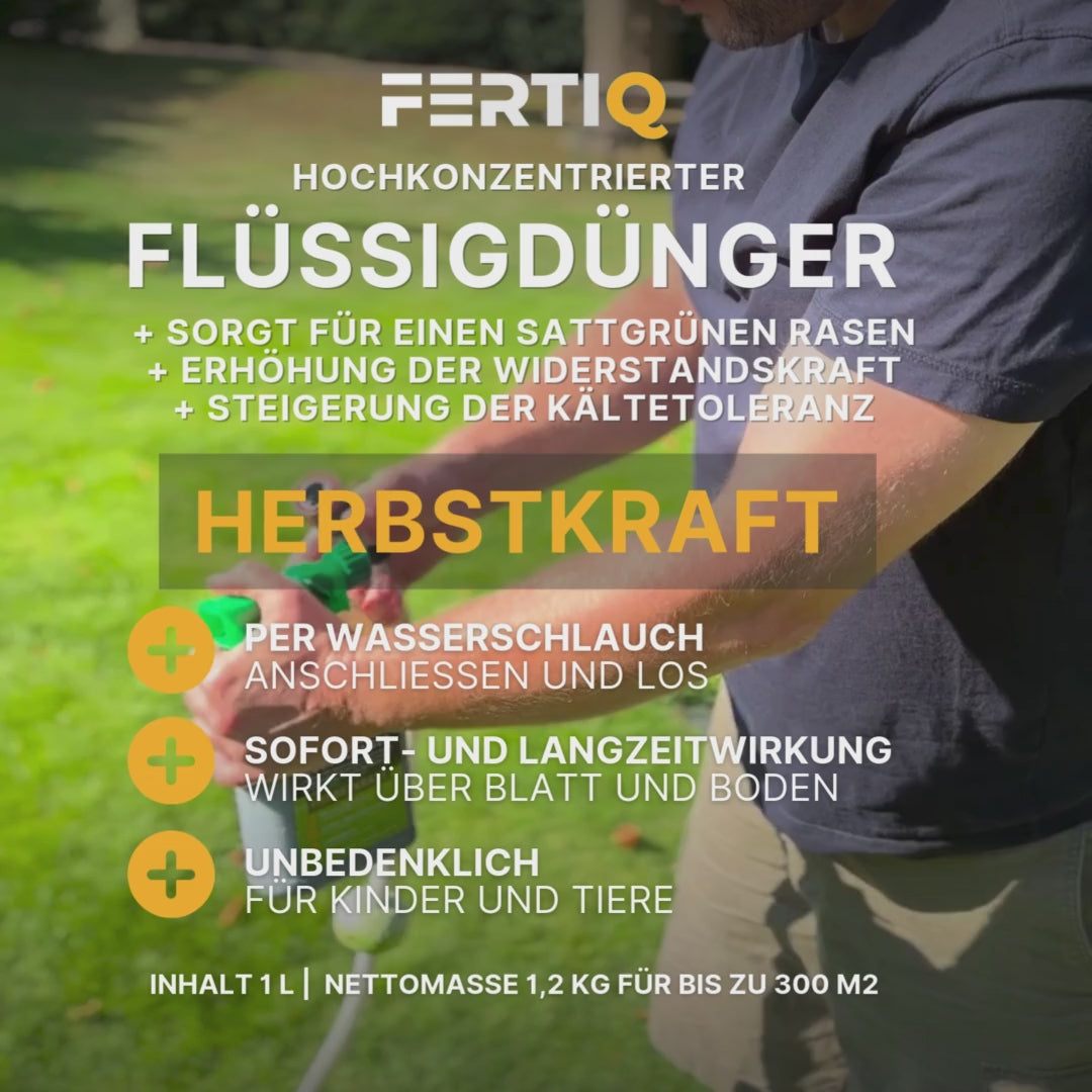 FERTIQ Herbstkraft ist ein hochwirksamer Flüssigdünger mit einem Kaliumanteilanteil von 10 % – ideal für Rasenflächen, die im Herbst besonders kräftig und tiefgrün erscheinen sollen. Die sofortige Kaliumwirkung von FERTIQ Herbstkraft entsteht durch die schnelle Aufnahme über das Blatt und die rasche Freisetzung aus organischen Verbindungen. Kalium stärkt Zellwände, reguliert den Wasserhaushalt und erhöht Frosthärte sowie Widerstandskraft. Zusätzlich liefert FERTIQ Herbstkraft wasserlösliche Proteine, freie Aminosäuren, Magnesium, Vitamine und organische Säuren für gesundes, kräftiges Pflanzenwachstum.